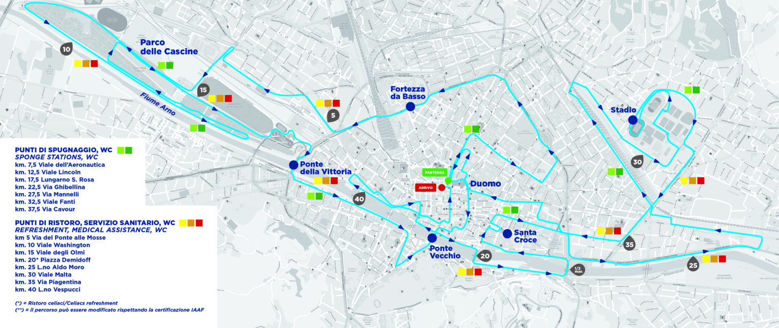 Il percorso della maratona interesserà: i viali di circonvallazione, dai lungarni a piazza Gaddi, i lungarni fino al Tuscany Hall, la zona dello stadio e il Parco delle Cascine. Gli orari di riapertura al transito varieranno in base ai diversi tratti del percorso.